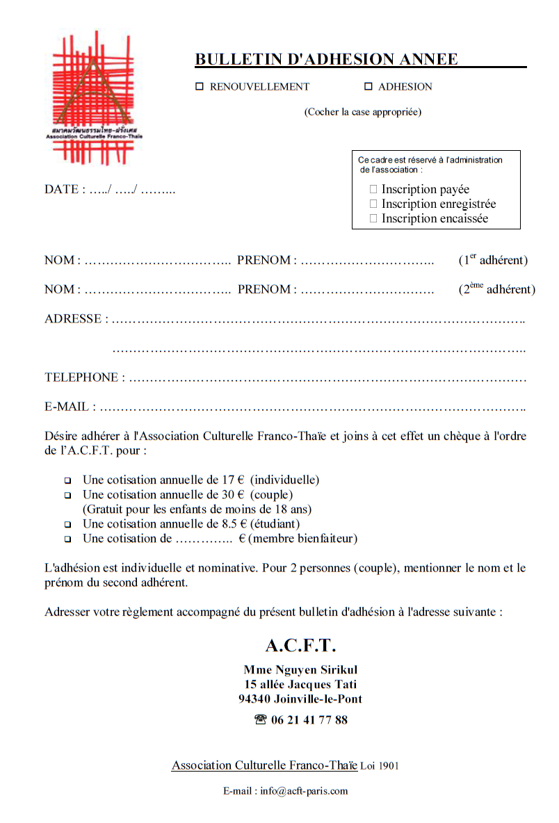 Le montant de l'adhésion annuelle à l'Association Culturelle Franco-Thaïe s'élève à 17,00€ pour une personne, 30,00€ pour un couple, 8,50€ pour les étudiants. Les enfants âgés de moins de 18 ans sont dispensés de cotisation. En vous inscrivant à l'association vous pourrez ainsi participer aux activités et rencontrer des personnes passionnées par la Thaïlande, sa culture, ses traditions ainsi que sa gastronomie. Vous pourrez partager vos expériences avec les différents membres ou simplement vous informer si vous envisagez de passer quelques temps en Thaïlande.